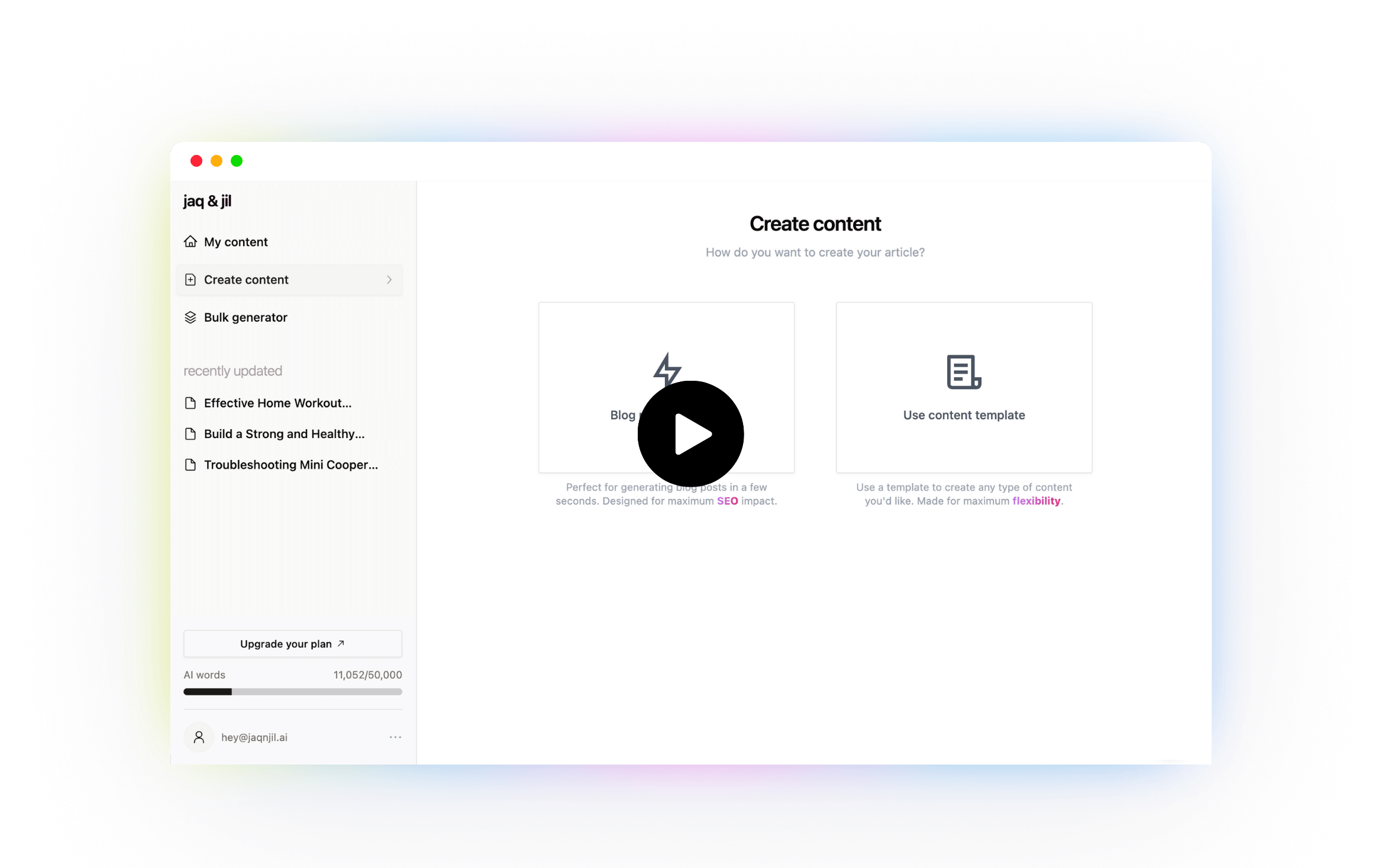 Bulk generate content with templates; from social posts to product descriptions, essays, marketing materials, and more.