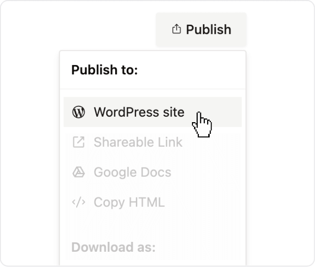 Flexible sharing options. Publish to Google Docs, generate a public preview link for instant feedback, or download your content in various formats like HTML, PDF, or DOCX to suit your content sharing needs.